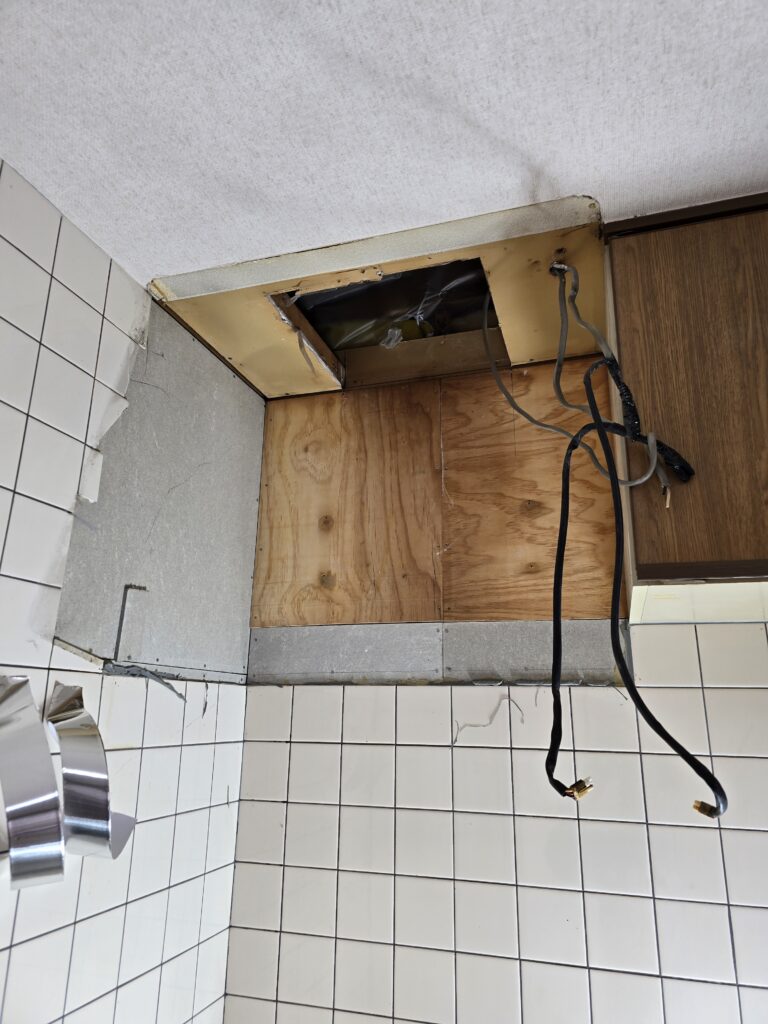 集合住宅オーナー様よりレンジフード交換工事のご依頼です!スイッチが壊れて入り切りが出来なくなってました😅あまりない幅のレンジフードでしたので、今後の交換も考えて取り付けします☝️