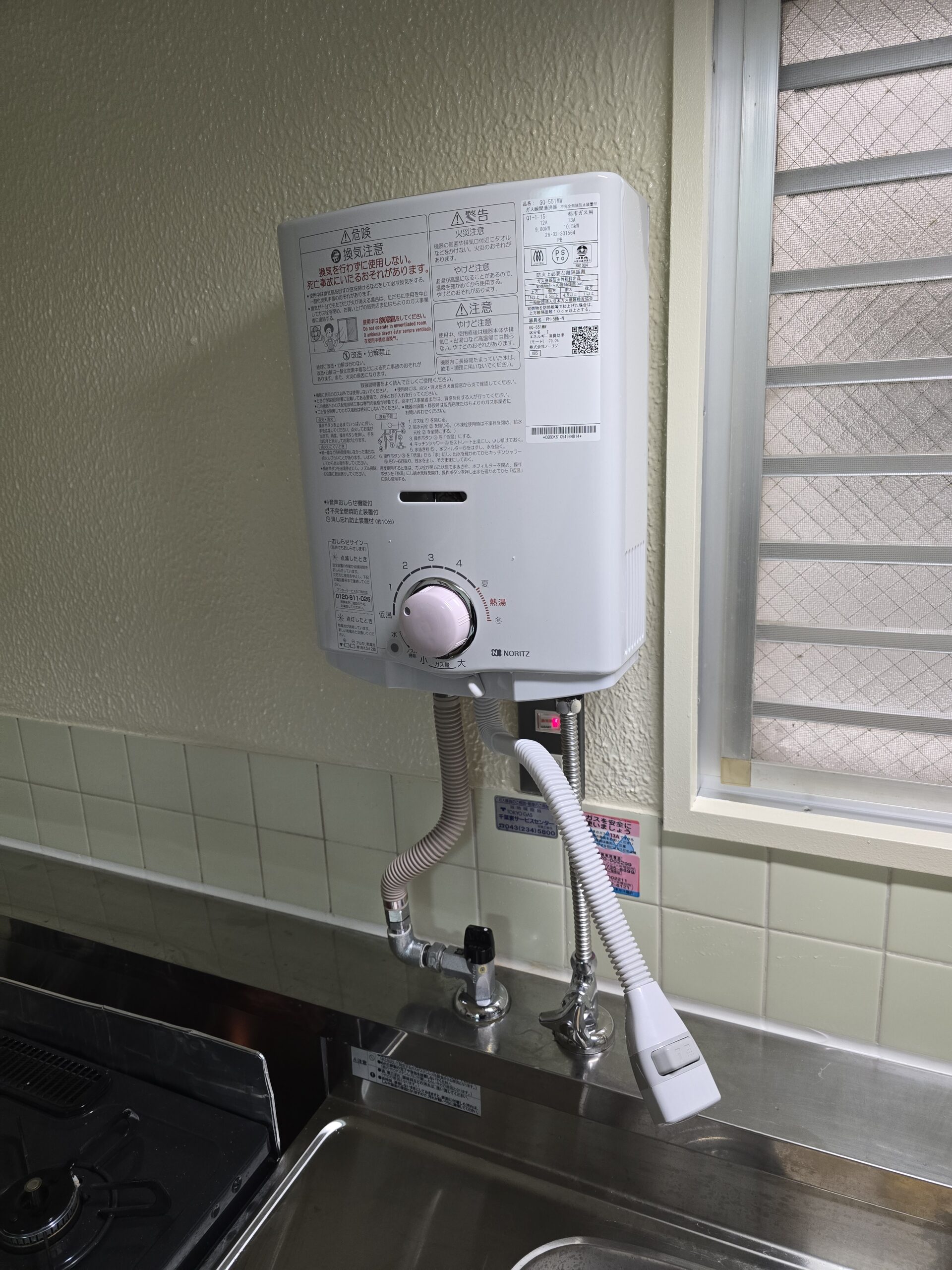 こちらは5号湯沸し器です。安全装置が付いて一酸化炭素中毒のリスクは少なくなりましたが、ご使用の際は必ず換気扇を回してご使用下さいね😅